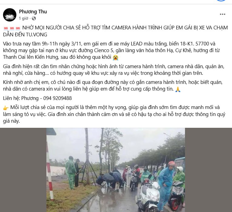 👉 Nếu ai có đi qua đoạn đường này, hoặc có người quen, hàng xóm có gắn camera ghi lại hình ảnh trong khung giờ trên, xin liên hệ với gia đình qua số: 094 9209 488 (chị Phương) để hỗ trợ cung cấp thông tin.